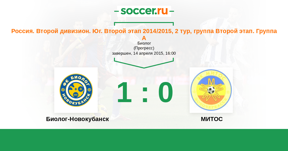 Россия. Вторая лига. Группа 1 20.04.2014 Биолог-Новокубанск Логотип футбольный клуб Биолог-Новокубанск 0:0 Логотип футбольный клуб МИТОС (Новочеркасск) МИТОС