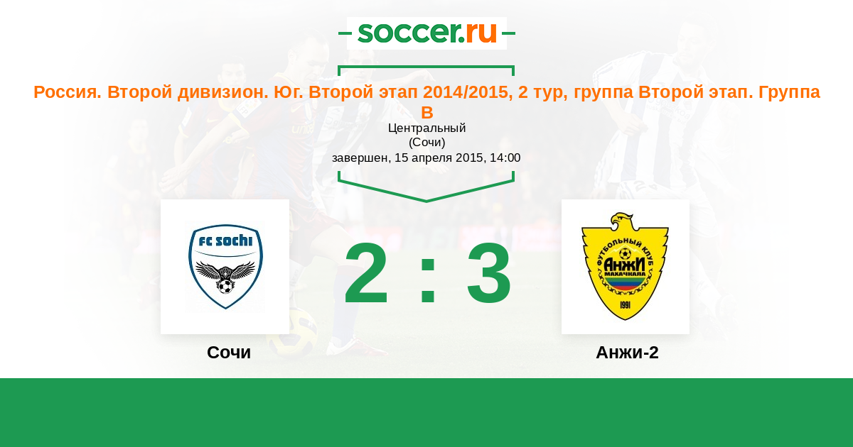 Россия. Вторая лига. Группа 1 12.05.2015 Анжи-2 Логотип футбольный клуб Анжи-2 (Махачкала) 3:0 Логотип футбольный клуб Сочи Сочи