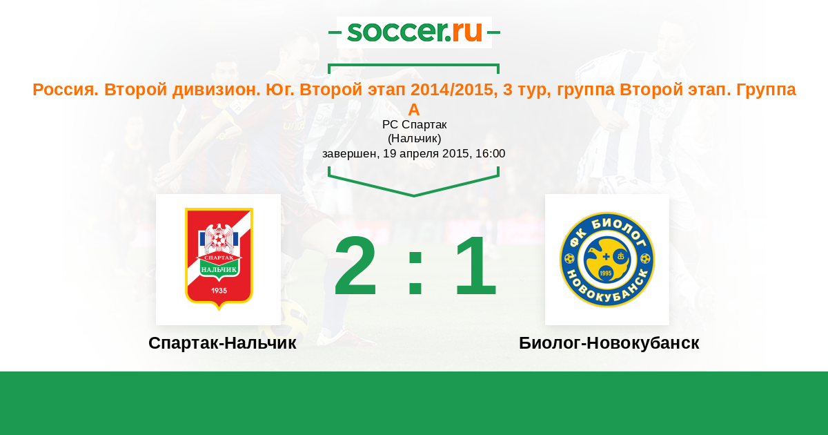 Россия. Вторая лига. Группа 1 25.04.2016 Биолог-Новокубанск Логотип футбольный клуб Биолог-Новокубанск 0:2 Логотип футбольный клуб Спартак-Нальчик Спартак-Нальчик