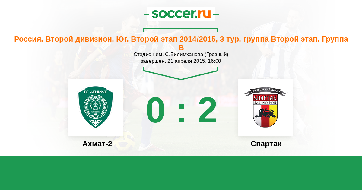 Россия. Вторая лига. Группа 1 18.05.2015 Алания Логотип футбольный клуб Алания (Владикавказ) 1:2 Логотип футбольный клуб Ахмат-2 (Грозный) Ахмат-2