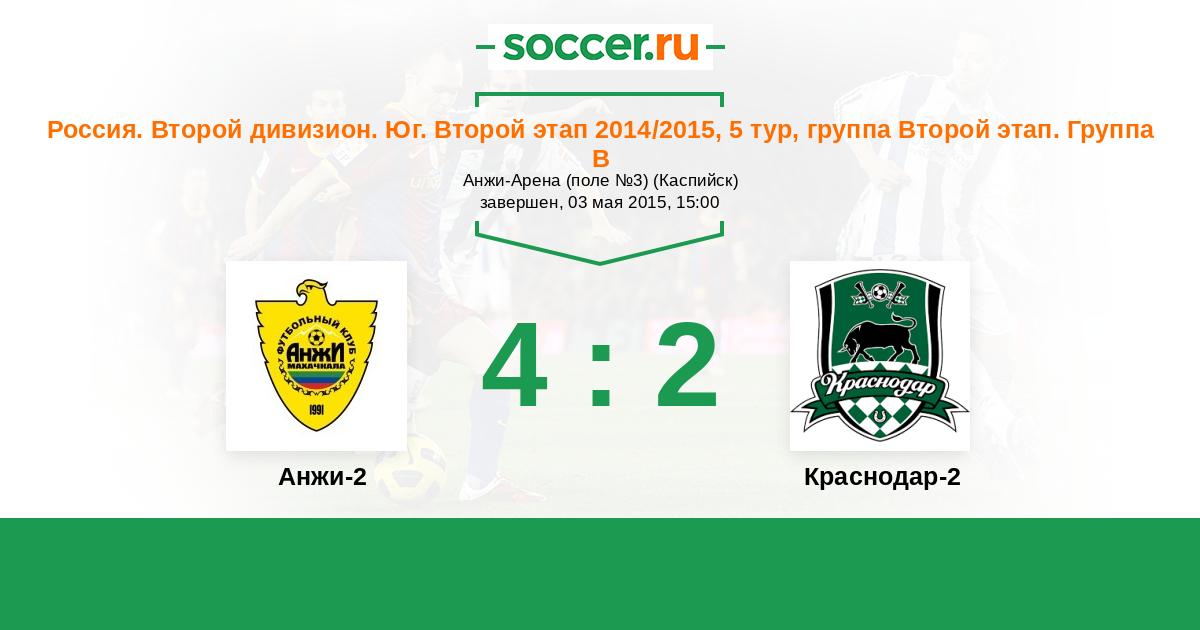 Россия. Вторая лига. Группа 1 31.05.2015 Краснодар-2 Логотип футбольный клуб Краснодар-2 3:0 Логотип футбольный клуб Анжи-2 (Махачкала) Анжи-2