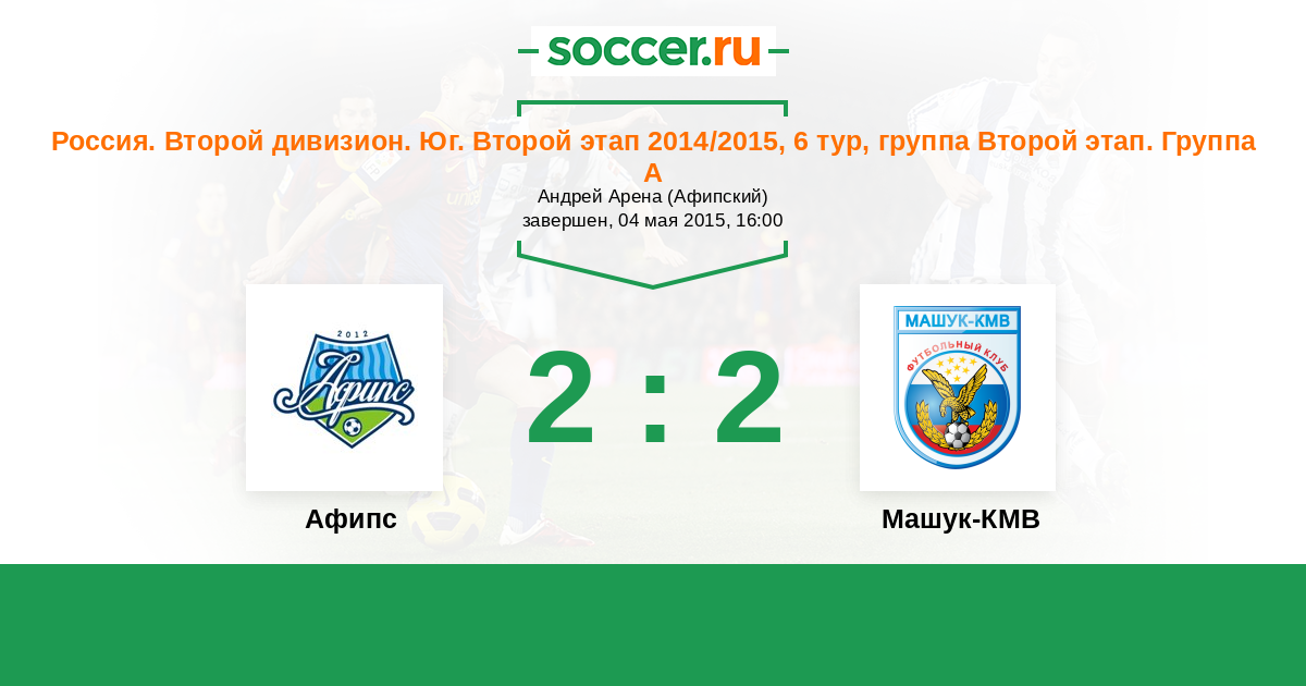 Россия. Вторая лига. Группа 1 30.05.2015 Машук-КМВ Логотип футбольный клуб Машук-КМВ (Пятигорск) 0:1 Логотип футбольный клуб Афипс (Афипский) Афипс