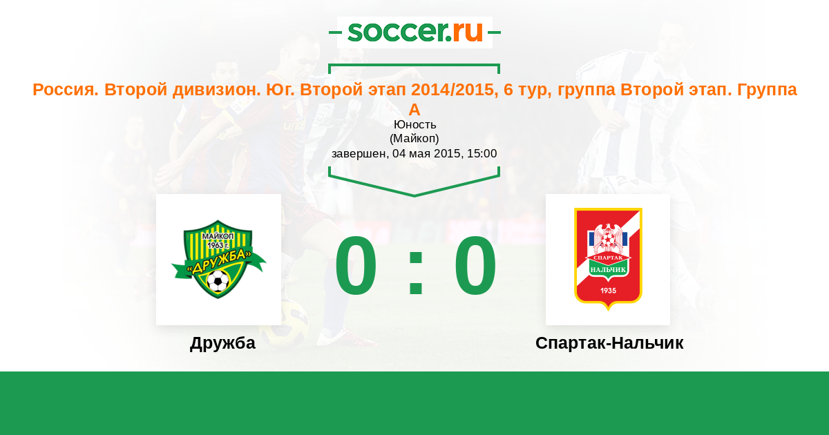 Россия. Вторая лига. Группа 1 30.05.2015 Спартак-Нальчик Логотип футбольный клуб Спартак-Нальчик 0:1 Логотип футбольный клуб Дружба (Майкоп) Дружба