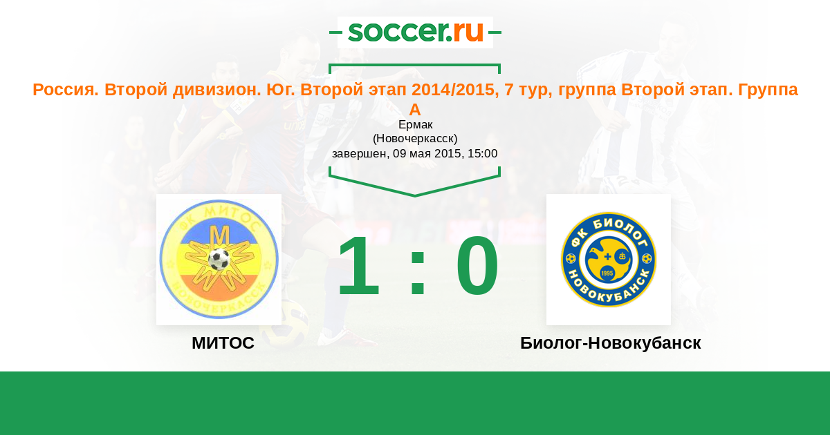 Россия. Вторая лига. Группа 1 14.04.2015 Биолог-Новокубанск Логотип футбольный клуб Биолог-Новокубанск 1:0 Логотип футбольный клуб МИТОС (Новочеркасск) МИТОС