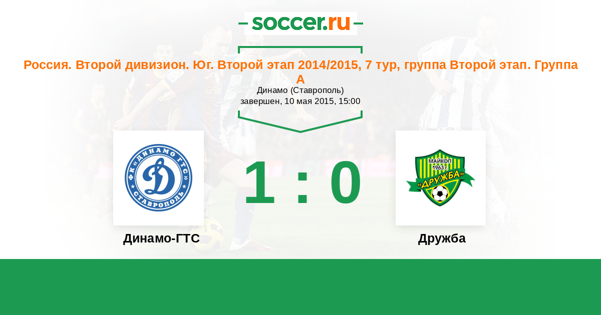 Россия. Вторая лига. Группа 1 10.05.2015 Динамо-ГТС Логотип футбольный клуб Динамо-ГТС (Ставрополь) 1:0 Логотип футбольный клуб Дружба (Майкоп) Дружба