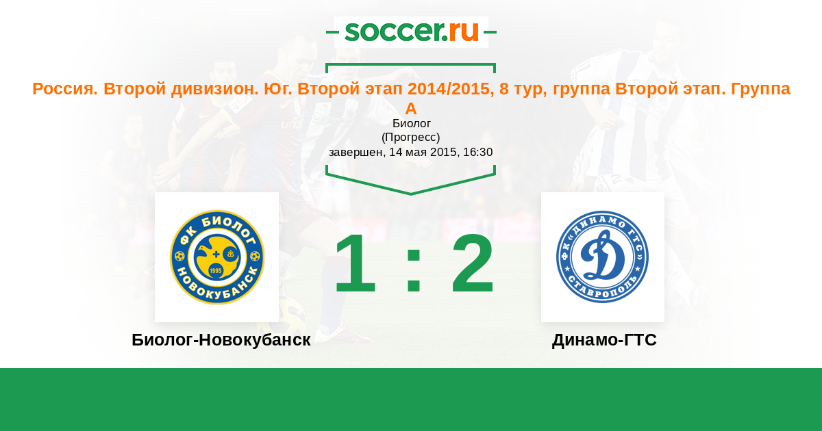Россия. Вторая лига. Группа 1 14.05.2015 Биолог-Новокубанск Логотип футбольный клуб Биолог-Новокубанск 1:2 Логотип футбольный клуб Динамо-ГТС (Ставрополь) Динамо-ГТС