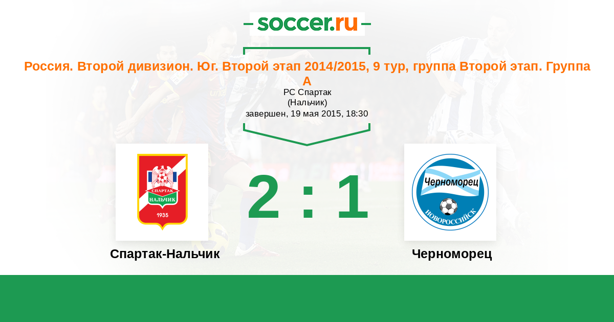 Россия. Вторая лига. Группа 1 24.04.2015 Черноморец Логотип футбольный клуб Черноморец (Новороссийск) 1:1 Логотип футбольный клуб Спартак-Нальчик Спартак-Нальчик