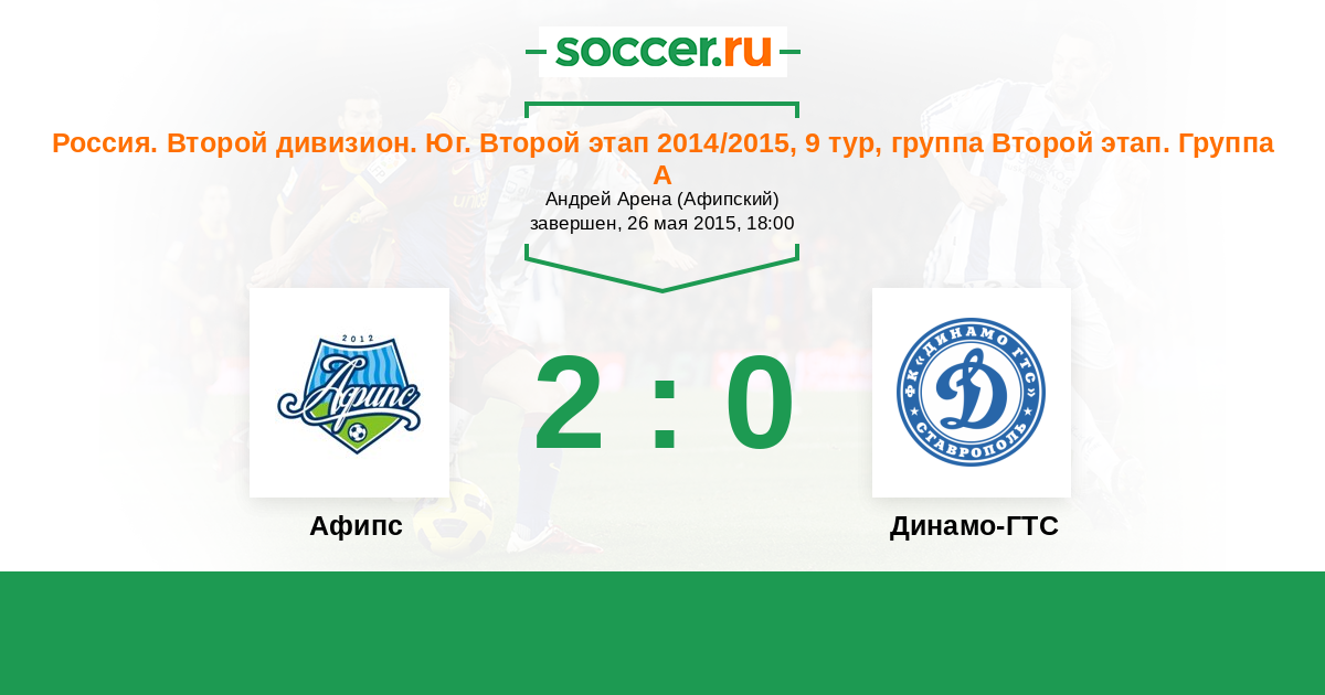 Россия. Вторая лига. Группа 1 26.05.2015 Афипс Логотип футбольный клуб Афипс (Афипский) 2:0 Логотип футбольный клуб Динамо-ГТС (Ставрополь) Динамо-ГТС