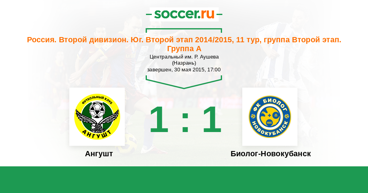 Россия. Вторая лига. Группа 1 04.05.2015 Биолог-Новокубанск Логотип футбольный клуб Биолог-Новокубанск 2:1 Логотип футбольный клуб Ангушт (Назрань) Ангушт