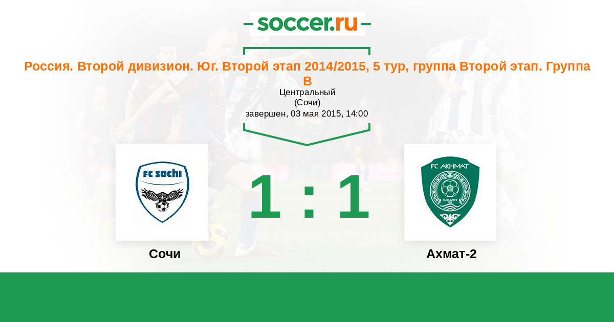 Россия. Вторая лига. Группа 1 28.05.2015 Ахмат-2 Логотип футбольный клуб Ахмат-2 (Грозный) 2:2 Логотип футбольный клуб Сочи Сочи