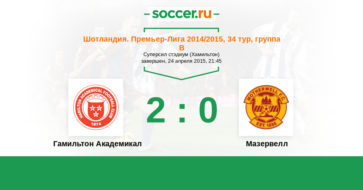 Шотландия. Премьер-Лига 20.03.2015 Мазервелл Логотип футбольный клуб Мазервелл 4:0 Логотип футбольный клуб Гамильтон Академикал Гамильтон Академикал