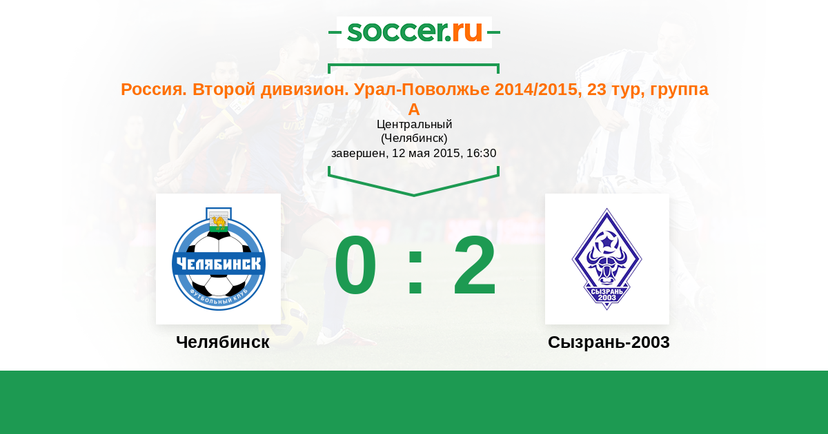 Россия. Вторая лига. Группа 4 28.08.2015 Сызрань-2003 Логотип футбольный клуб Сызрань-2003 2:0 Логотип футбольный клуб Челябинск Челябинск