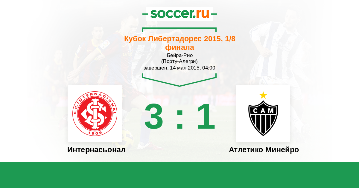Кубок Либертадорес 07.05.2015 Атлетико Минейро Логотип футбольный клуб Атлетико Минейро (Белу-Оризонти) 2:2 Логотип футбольный клуб Интернасьонал (Порту-Алегри) Интернасьонал