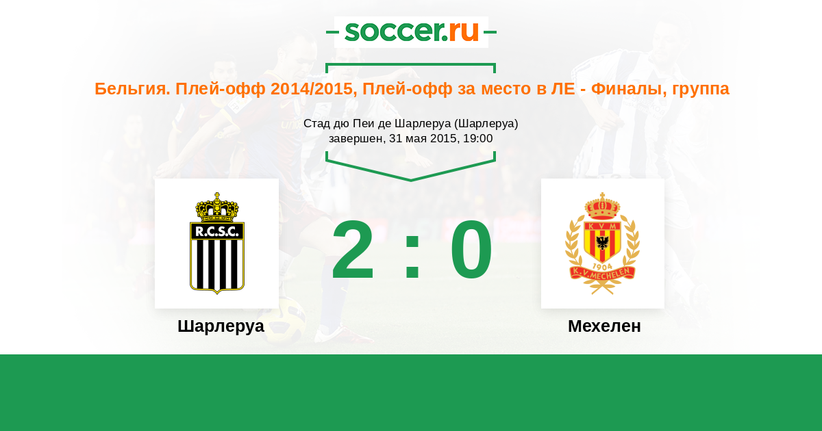 Бельгия. Про-Лига 28.05.2015 Мехелен Логотип футбольный клуб Мехелен 2:1 Логотип футбольный клуб Шарлеруа Шарлеруа