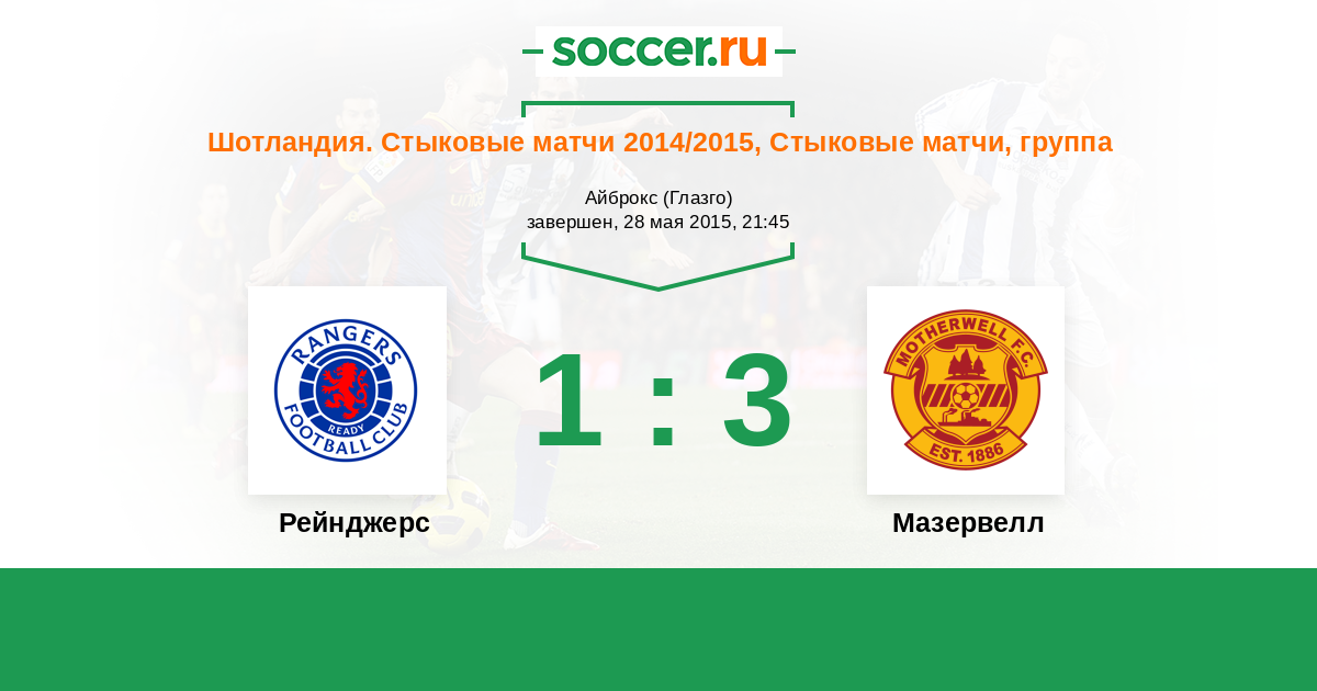 Шотландия. Премьер-Лига 31.05.2015 Мазервелл Логотип футбольный клуб Мазервелл 3:0 Логотип футбольный клуб Рейнджерс (Глазго) Рейнджерс