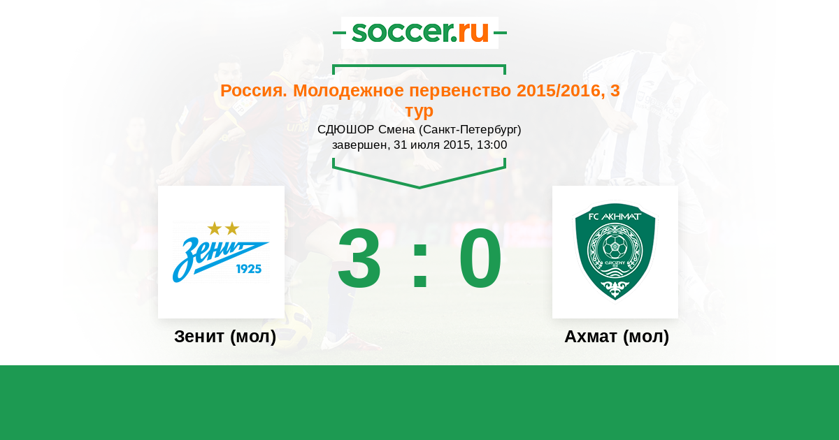 Россия. Премьер-Лига U21 13.08.2017 Зенит (мол) Логотип футбольный клуб Зенит (мол) (Санкт-Петербург) 2:1 Логотип футбольный клуб Ахмат (мол) (Грозный) Ахмат (мол)