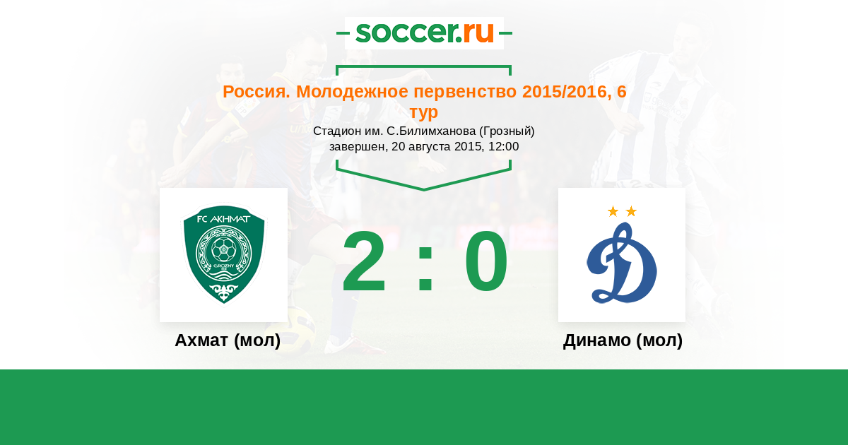 Россия. Премьер-Лига U21 28.07.2017 Ахмат (мол) Логотип футбольный клуб Ахмат (мол) (Грозный) 0:0 Логотип футбольный клуб Динамо (мол) (Москва) Динамо (мол)
