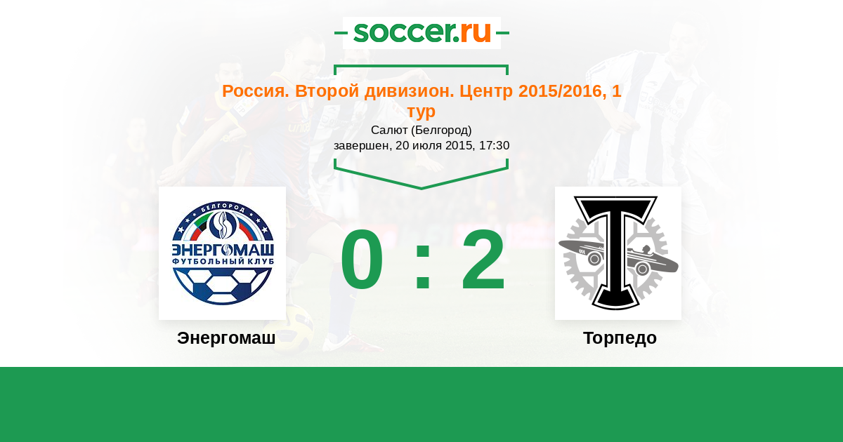 Россия. Вторая лига. Группа 3 19.07.2017 Энергомаш Логотип футбольный клуб Энергомаш (Белгород) 0:0 Логотип футбольный клуб Торпедо (Москва) Торпедо