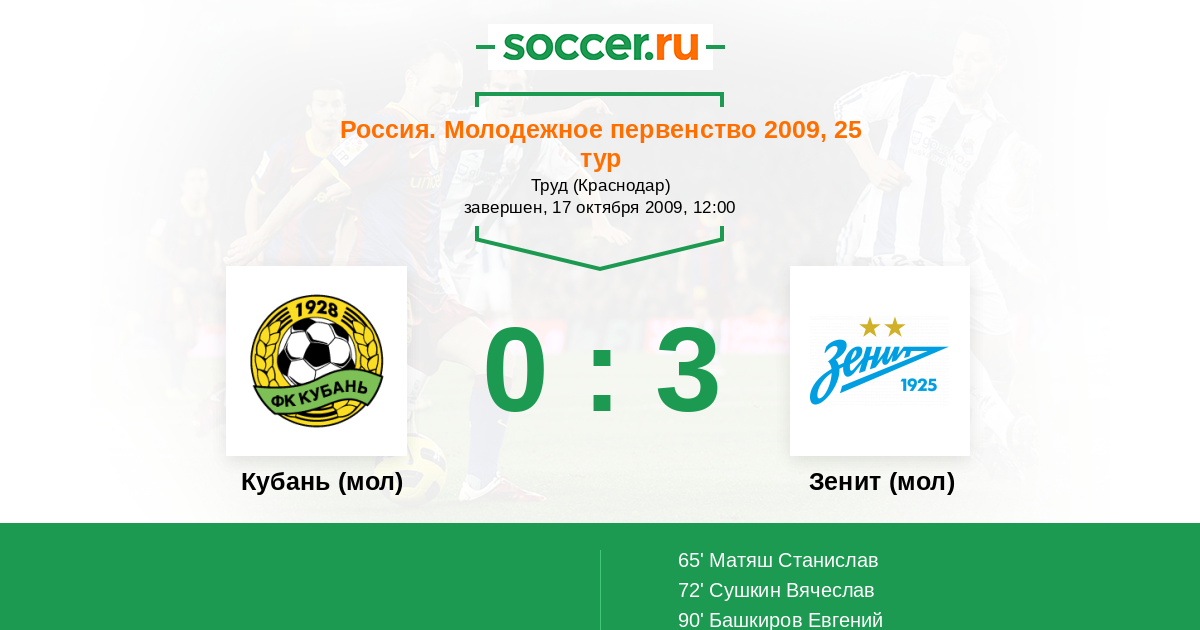 Протокол матча Кубань (мол) против Зенит (мол)