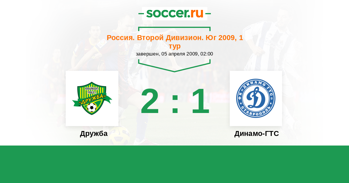 Россия. Вторая лига. Группа 1 14.04.2015 Дружба Логотип футбольный клуб Дружба (Майкоп) 1:1 Логотип футбольный клуб Динамо-ГТС (Ставрополь) Динамо-ГТС