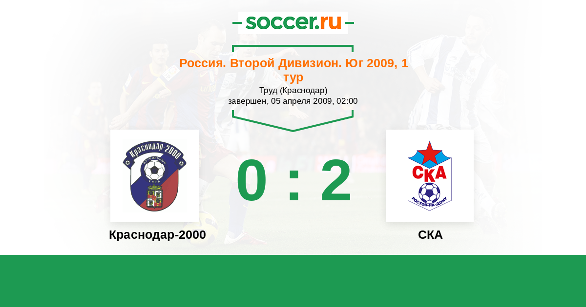 Россия. Вторая лига. Группа 1 06.05.2010 Краснодар-2000 Логотип футбольный клуб Краснодар-2000 1:1 Логотип футбольный клуб СКА (Ростов-на-Дону) СКА
