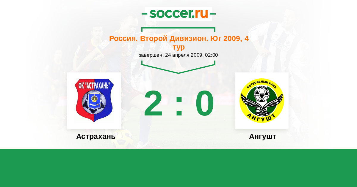 Россия. Вторая лига. Группа 1 30.04.2010 Ангушт Логотип футбольный клуб Ангушт (Назрань) 1:1 Логотип футбольный клуб Астрахань Астрахань