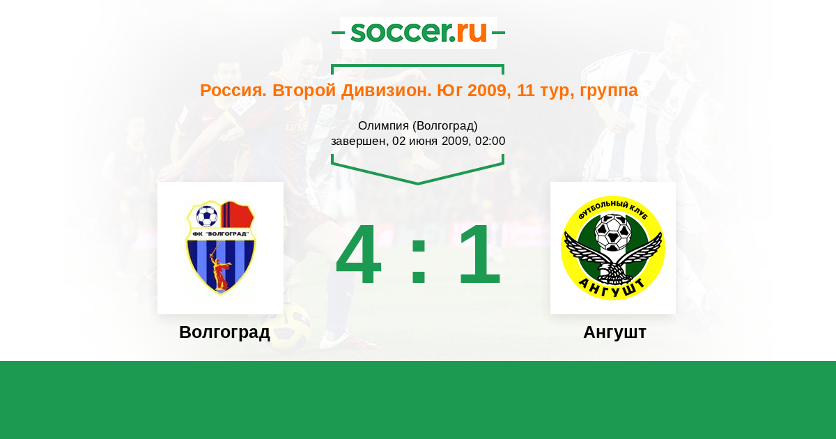Россия. Вторая лига. Группа 1 20.09.2009 Ангушт Логотип футбольный клуб Ангушт (Назрань) 2:2 Логотип футбольный клуб Волгоград Волгоград