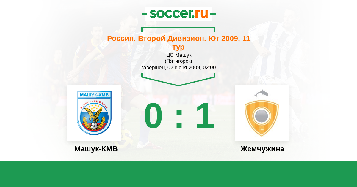 Россия. Вторая лига. Группа 1 20.09.2009 Жемчужина Логотип футбольный клуб Жемчужина (Сочи) 5:1 Логотип футбольный клуб Машук-КМВ (Пятигорск) Машук-КМВ