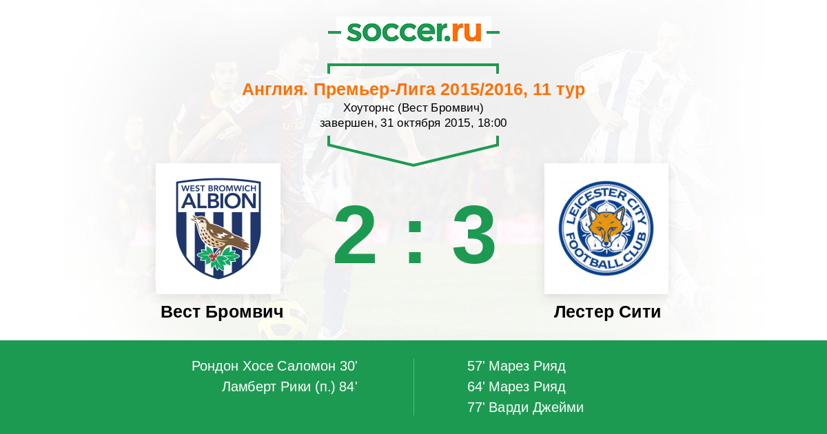Протокол матча Вест Бромвич против Лестер Сити
