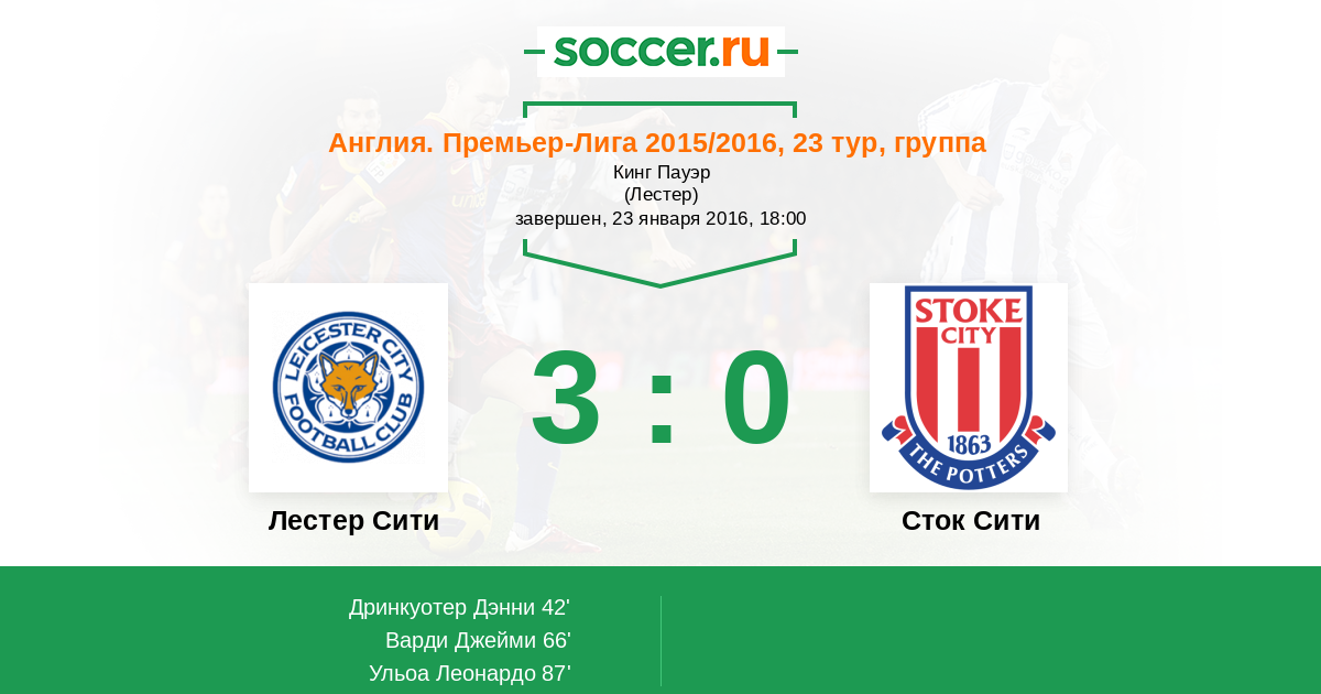 66' (2:0) Варди Джейми (9) (Дринкуотер Дэнни (4))
