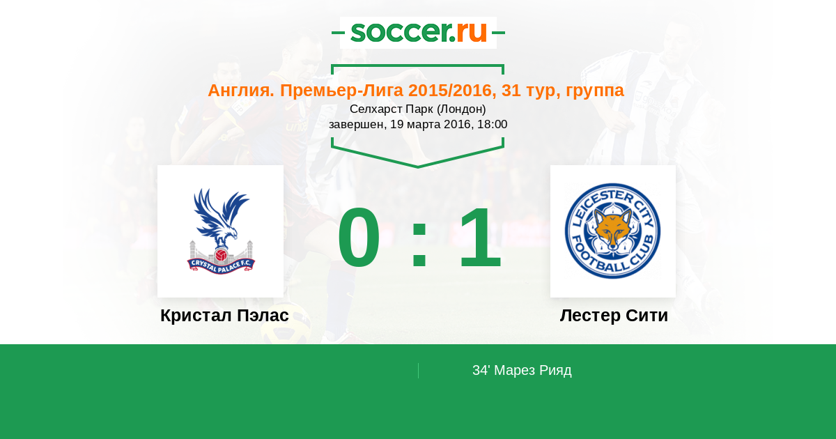 34' (0:1) Марез Рияд (26) (Варди Джейми (9))