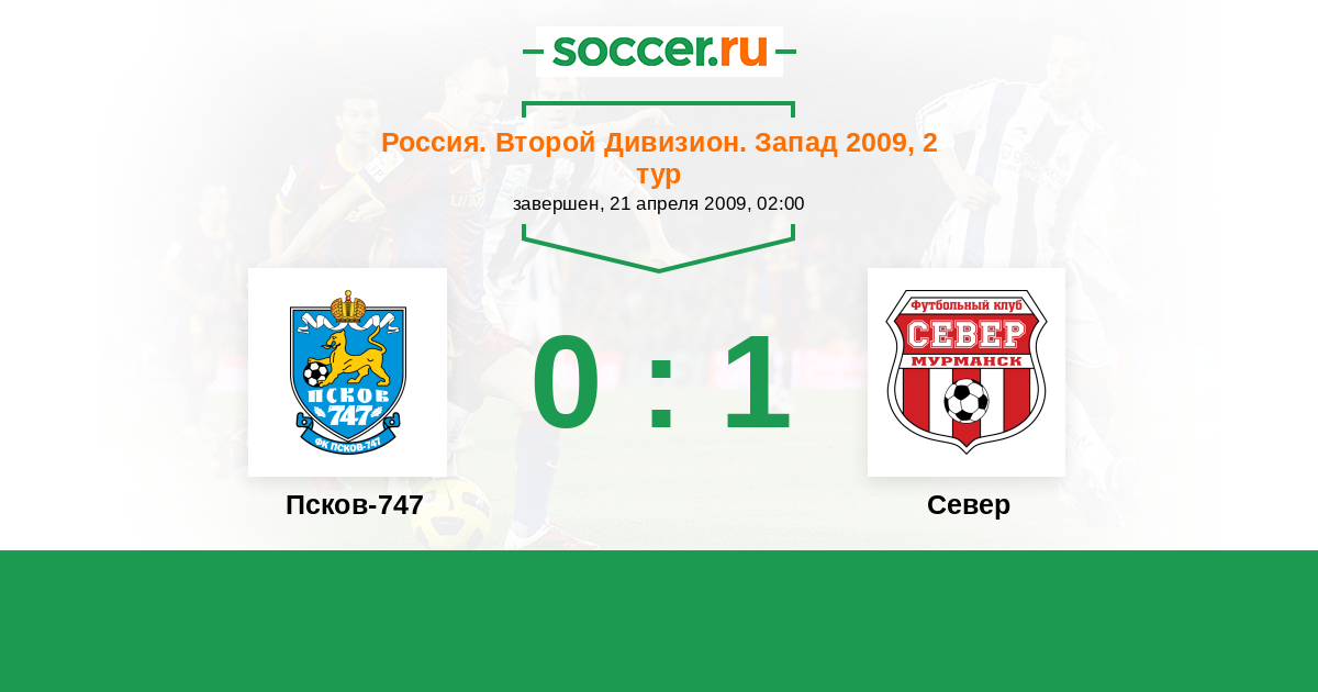 Россия. Вторая лига. Группа 2 05.08.2009 Север Логотип футбольный клуб Север (Мурманск) 0:0 Логотип футбольный клуб Псков-747 Псков-747