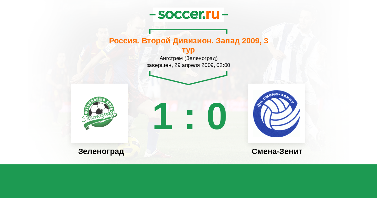 Россия. Вторая лига. Группа 2 12.08.2009 Смена-Зенит Логотип футбольный клуб Смена-Зенит (Санкт-Петербург) 3:2 Логотип футбольный клуб Зеленоград (Москва) Зеленоград