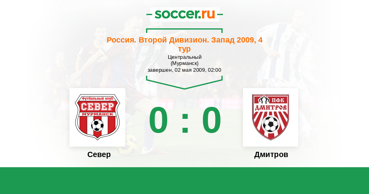 Россия. Вторая лига. Группа 2 15.08.2009 Дмитров Логотип футбольный клуб Дмитров 0:0 Логотип футбольный клуб Север (Мурманск) Север