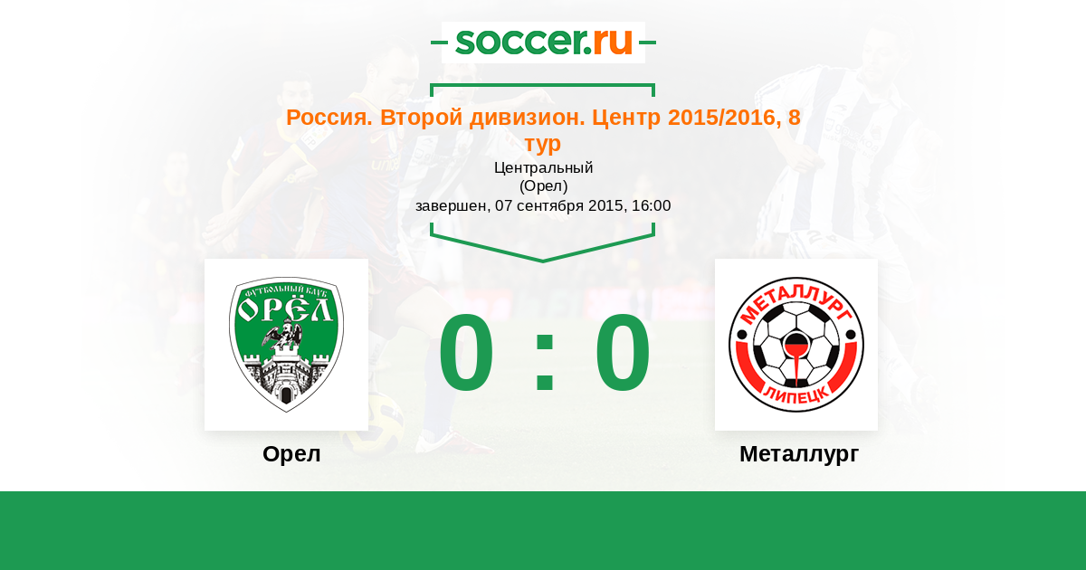 Россия. Вторая лига. Группа 3 17.09.2016 Орел Логотип футбольный клуб Орел 0:1 Логотип футбольный клуб Металлург (Липецк) Металлург