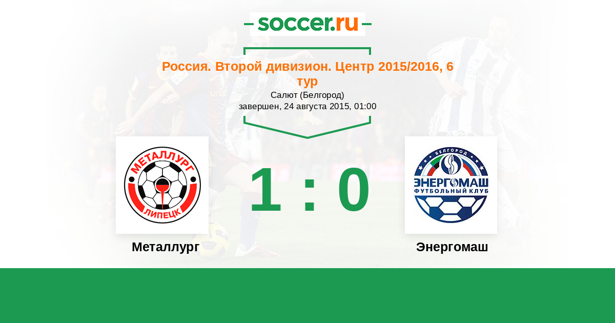 Россия. Вторая лига. Группа 3 09.10.2016 Металлург Логотип футбольный клуб Металлург (Липецк) 0:4 Логотип футбольный клуб Энергомаш (Белгород) Энергомаш