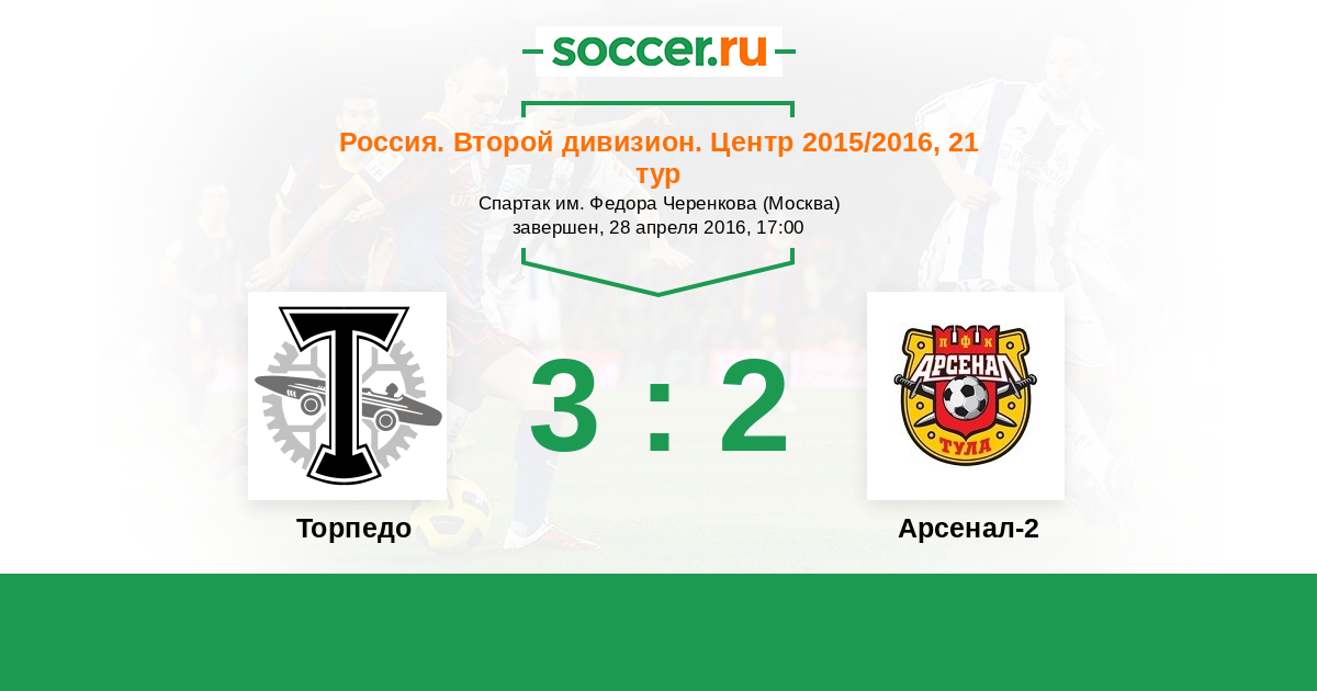 Россия. Вторая лига. Группа 3 29.04.2017 Торпедо Логотип футбольный клуб Торпедо (Москва) 3:0 Логотип футбольный клуб Арсенал-2 (Тула) Арсенал-2