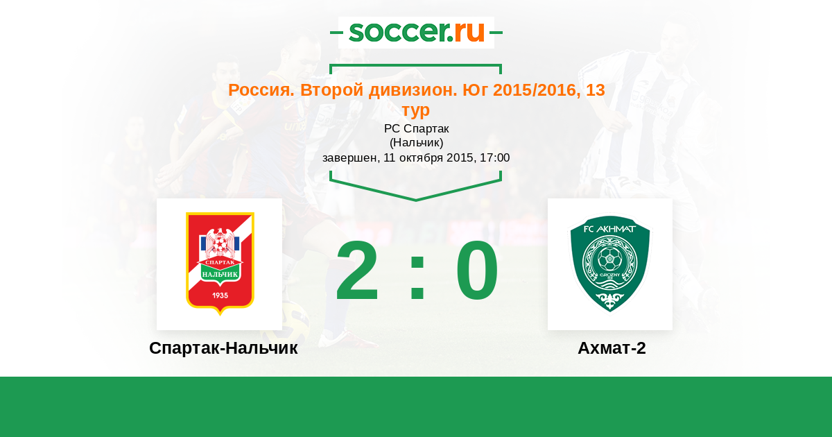 Россия. Вторая лига. Группа 1 07.09.2014 Спартак-Нальчик Логотип футбольный клуб Спартак-Нальчик 0:0 Логотип футбольный клуб Ахмат-2 (Грозный) Ахмат-2