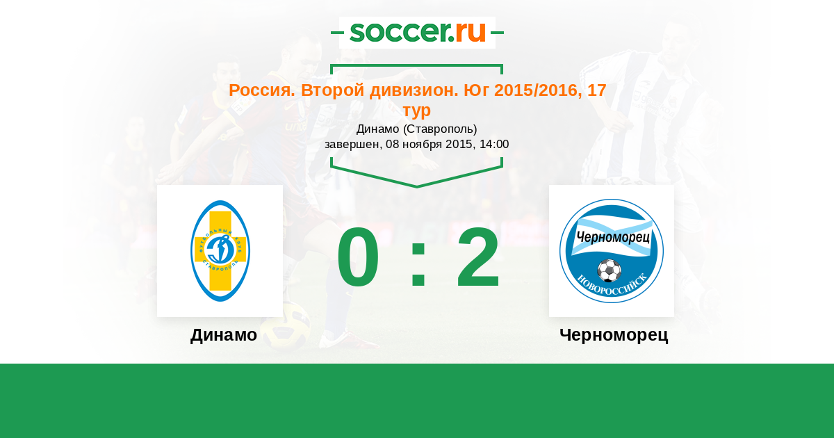 Россия. Вторая лига. Группа 1 18.08.2015 Черноморец Логотип футбольный клуб Черноморец (Новороссийск) 3:2 Логотип футбольный клуб Динамо Ставрополь Динамо Ставрополь