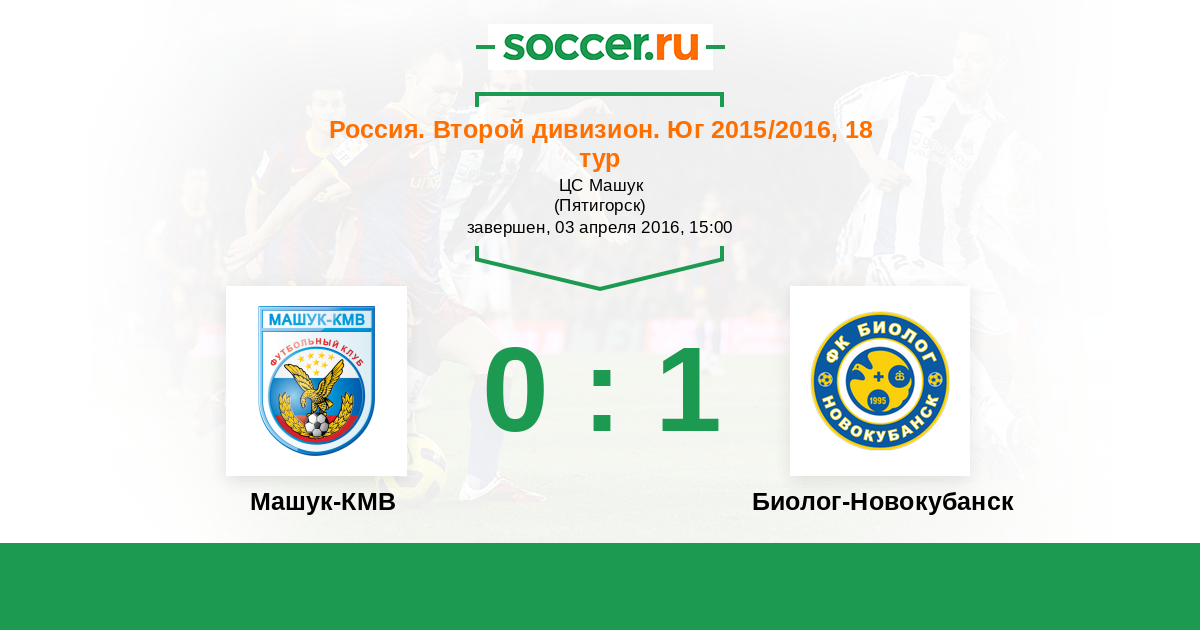 Россия. Вторая лига. Группа 1 25.08.2015 Биолог-Новокубанск Логотип футбольный клуб Биолог-Новокубанск 1:0 Логотип футбольный клуб Машук-КМВ (Пятигорск) Машук-КМВ