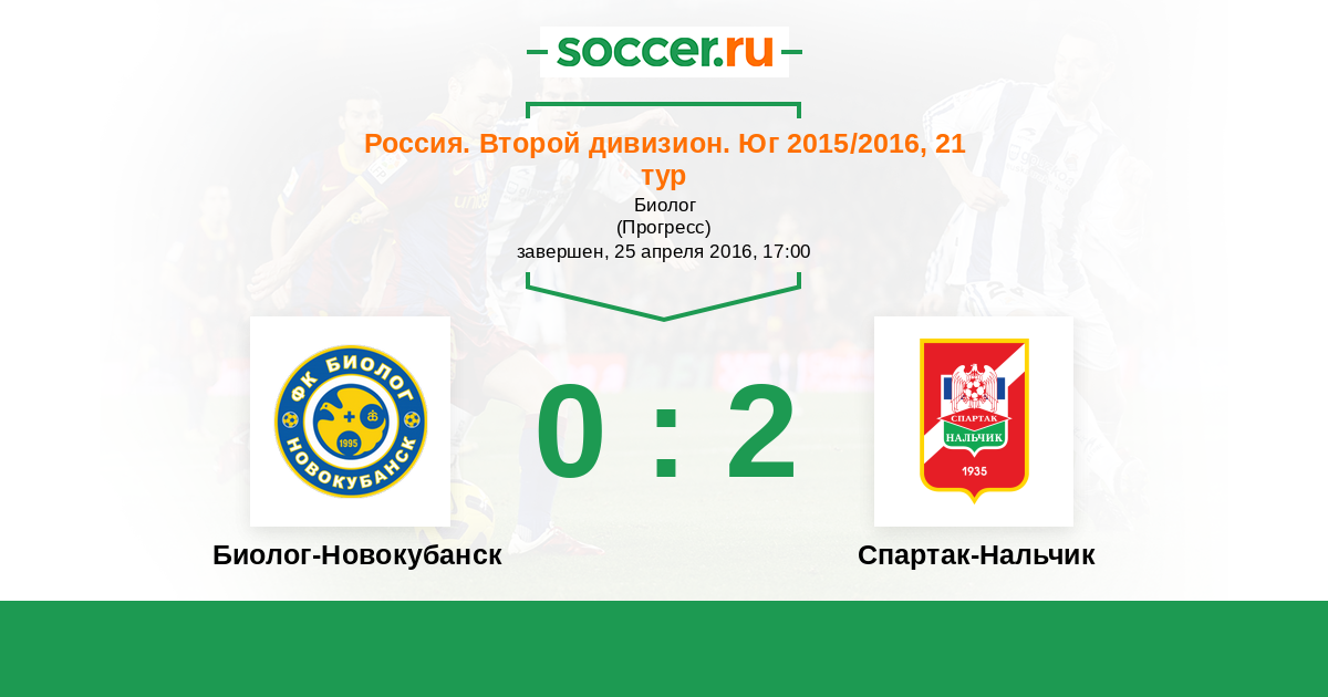 Россия. Вторая лига. Группа 1 19.04.2015 Спартак-Нальчик Логотип футбольный клуб Спартак-Нальчик 2:1 Логотип футбольный клуб Биолог-Новокубанск Биолог-Новокубанск