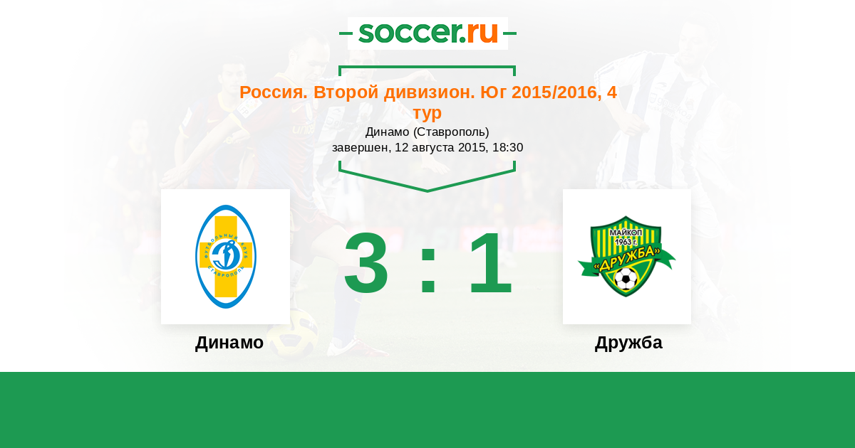 Россия. Вторая лига. Группа 1 18.08.2018 Дружба Логотип футбольный клуб Дружба (Майкоп) 3:0 Логотип футбольный клуб Динамо Ставрополь Динамо Ставрополь