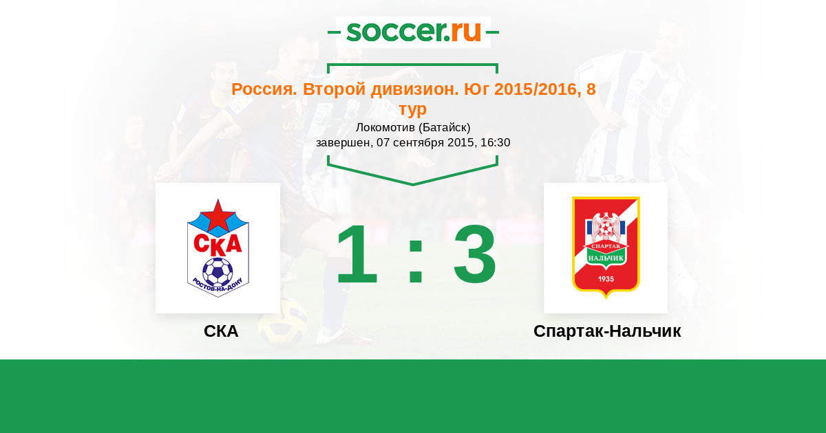 Россия. Вторая лига. Группа 1 16.09.2017 Спартак-Нальчик Логотип футбольный клуб Спартак-Нальчик 3:0 Логотип футбольный клуб СКА (Ростов-на-Дону) СКА