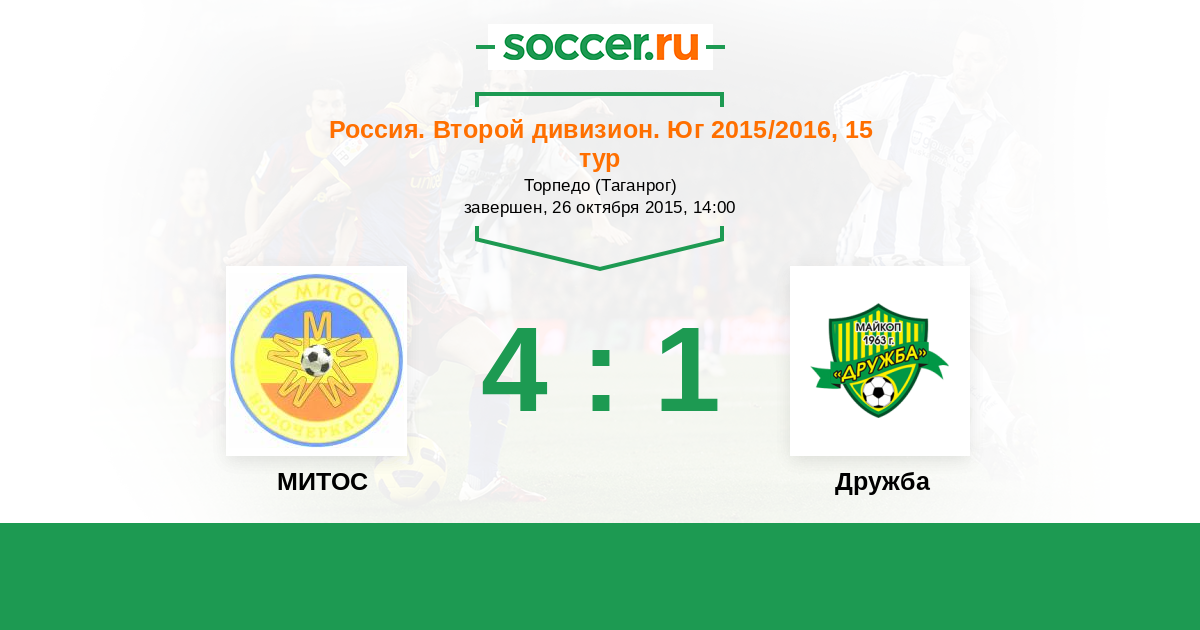 Россия. Вторая лига. Группа 1 04.08.2015 Дружба Логотип футбольный клуб Дружба (Майкоп) 1:2 Логотип футбольный клуб МИТОС (Новочеркасск) МИТОС