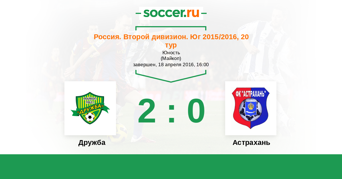Россия. Вторая лига. Группа 1 07.09.2015 Астрахань Логотип футбольный клуб Астрахань 0:1 Логотип футбольный клуб Дружба (Майкоп) Дружба