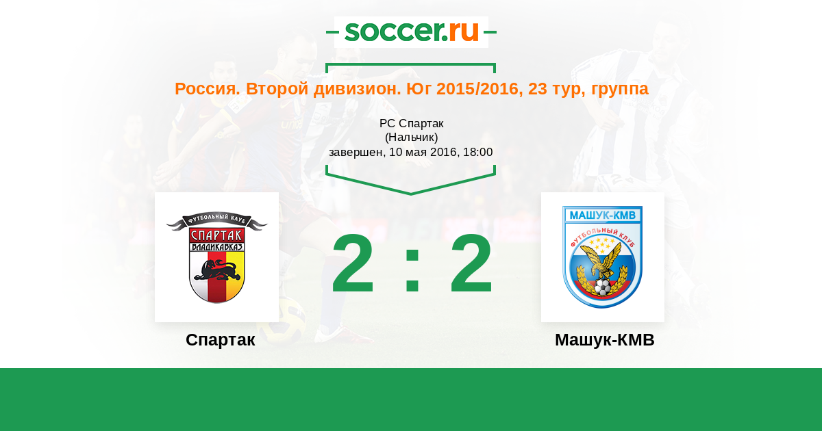 Россия. Вторая лига. Группа 1 28.05.2017 Спартак Логотип футбольный клуб Спартак (Владикавказ) 2:1 Логотип футбольный клуб Машук-КМВ (Пятигорск) Машук-КМВ