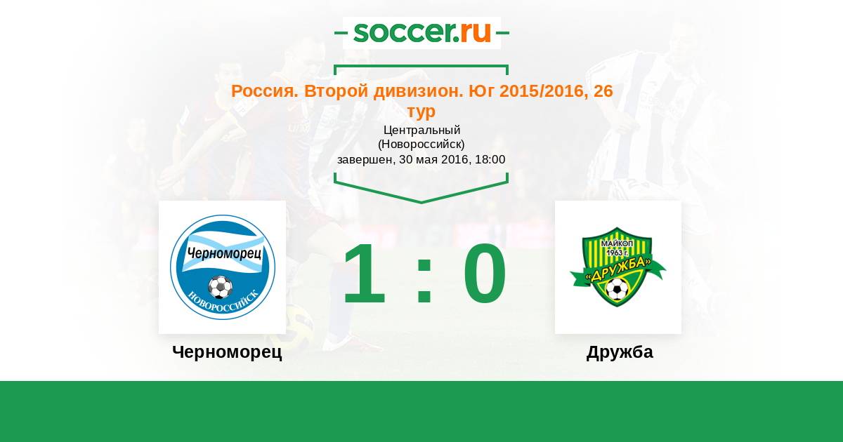 Россия. Вторая лига. Группа 1 25.09.2016 Дружба Логотип футбольный клуб Дружба (Майкоп) 1:5 Логотип футбольный клуб Черноморец (Новороссийск) Черноморец