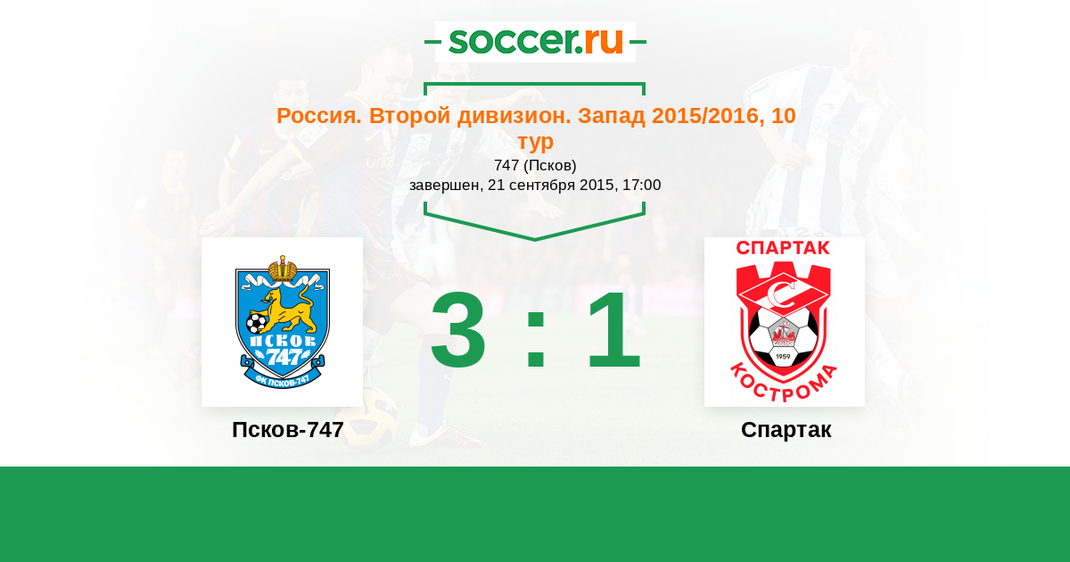 Россия. Вторая лига. Группа 2 18.05.2015 Псков-747 Логотип футбольный клуб Псков-747 1:1 Логотип футбольный клуб Спартак Кострома Спартак Кострома