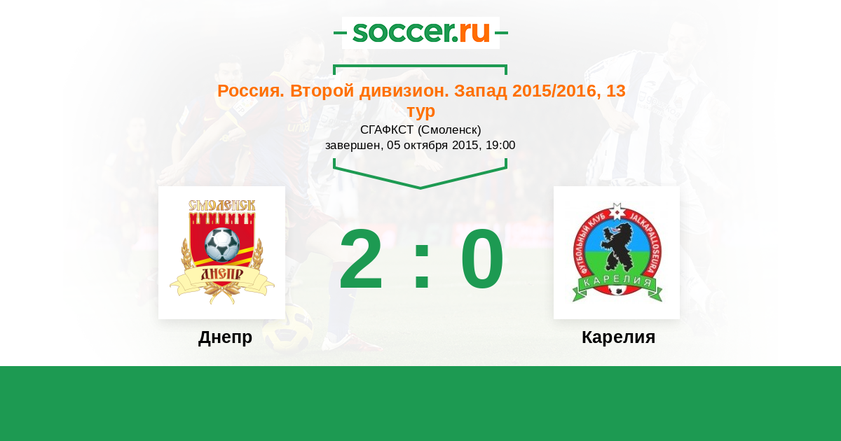 Россия. Вторая лига. Группа 2 16.05.2016 Карелия Логотип футбольный клуб Карелия (Петрозаводск) 0:0 Логотип футбольный клуб Днепр (Смоленск) Днепр