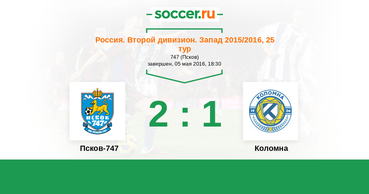 Россия. Вторая лига. Группа 2 11.05.2018 Коломна Логотип футбольный клуб Коломна 1:0 Логотип футбольный клуб Псков-747 Псков-747